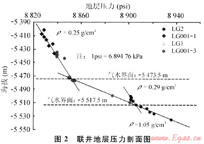 MDT在LG001-1井井深6171.19m測到1個(gè)壓力點(diǎn),測點(diǎn)處海拔-5573.78m,壓力61.2717MPa。將此海拔代入LG1井氣柱方程,計(jì)算壓力61.184MPa。用LG1井氣柱方程推算壓力比實(shí)測壓力低0.0877MPa,兩者相差較小,因此判定它們?yōu)橥粔毫ο到y(tǒng)。LG001-3井水層段測到了多點(diǎn)MDT壓力資料,與LG1、LG001-1、LG001-3井進(jìn)行多井壓力分析,分析結(jié)果表明,LG1、LG001-1、LG001-3并氣層與LG3井水層在縱向上呈較好的氣水分布規(guī)律,判定它們?yōu)橥粔毫ο到y(tǒng)。
