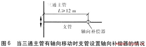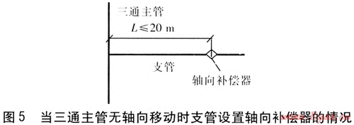 當(dāng)在支管上無(wú)法實(shí)現(xiàn)自然補(bǔ)償時(shí),可以考慮在支管上設(shè)置軸向補(bǔ)償器,軸向補(bǔ)償器的類(lèi)型可根據(jù)供回水溫度、支管的管徑及其他技術(shù)要求選用。當(dāng)三通主管無(wú)軸向移動(dòng)時(shí),支管設(shè)置軸向補(bǔ)償器的情況見(jiàn)圖5。為了降低支管的軸向移動(dòng)對(duì)三通的推力,軸向補(bǔ)償器距三通的距離L應(yīng)滿足L≤20m[7]。