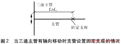 ② 當(dāng)三通主管允許有軸向位移時(shí),三通主管的軸向位移將使支管產(chǎn)生側(cè)向位移,此時(shí)應(yīng)控制三通到主管補(bǔ)償裝置的距離,保證三通處主管的最大軸向位移不大于50mm。三通處主管的最大軸向位移smax的計(jì)算式為: