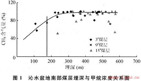 一般取甲烷濃度80%為風(fēng)氧化帶的底界。用不同埋深或不同煤層上覆有效厚度的鉆孔、煤層氣井或煤礦抽放出得煤層氣進(jìn)行氣體組分分析,得出風(fēng)氧化帶的深度。如沁水盆地南部煤層氣藏甲烷組分含量隨煤層埋藏深度的加大而增加,甲烷組分含量大于80%對(duì)應(yīng)的煤層埋深為180m,即可確定風(fēng)氧化帶的深度為180m左右(圖1)。