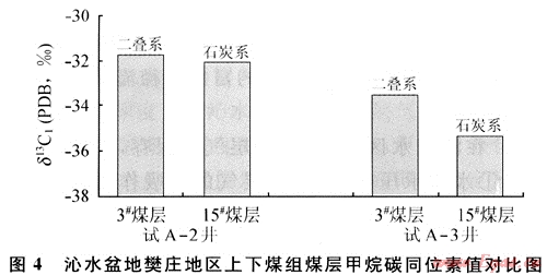 徑流水區(qū)地下水對(duì)煤層氣破壞的現(xiàn)象除了使含氣量降低以外,主要表現(xiàn)在流動(dòng)的地下水可使煤層甲烷碳同位素變輕,變輕的程度受水動(dòng)力強(qiáng)度影響。在我國(guó)的華北地區(qū),下部太原組煤系直接覆蓋在奧陶系灰?guī)r之上,煤系與下伏奧陶系石灰?guī)r巖溶裂隙含水層強(qiáng)徑流帶容易產(chǎn)生水力聯(lián)系,所以太原組下主煤層的煤系水動(dòng)力條件往往強(qiáng)于山西組上主煤層煤系。在煤層甲烷碳同位素值方面,下煤組煤層甲烷碳同位素輕于上煤組的現(xiàn)象十分普遍。例如鄂爾多斯盆地吳堡地區(qū),上煤組的3#煤層中的甲烷碳同位素值為-38.25‰,下煤組的10#煤層的甲烷碳同位素值為-46.26‰;沁水盆地試A-2井3#煤層和15#煤層甲烷碳同位素值分別為-31.8‰和-32.1‰;試A-3井甲烷碳同位素值分別為-33.56‰和-35.39‰(圖4)。