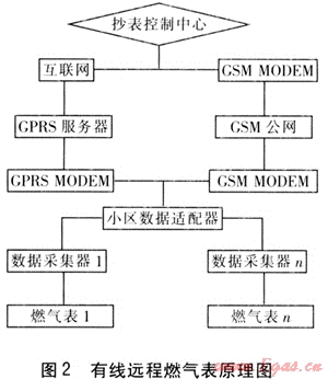 通過數(shù)字直讀式遠(yuǎn)程自動(dòng)抄表系統(tǒng),將無線數(shù)字通信技術(shù)、傳感器技術(shù)、單片機(jī)技術(shù)及大型數(shù)據(jù)庫管理系統(tǒng)有機(jī)結(jié)合在一起。抄表控制中心可以通過互聯(lián)網(wǎng)將數(shù)據(jù)傳輸至GPRS服務(wù)器,發(fā)送無線信息經(jīng)GPRS MODEM(無線調(diào)制調(diào)解器)接收處理后傳送給小區(qū)數(shù)據(jù)適配器,或者可以通過GSM MODEM(GSM調(diào)制解調(diào)器)將數(shù)據(jù)轉(zhuǎn)換為無線信息發(fā)送到GSM公網(wǎng),經(jīng)小區(qū)GSM MODEM接收處理后傳送給小區(qū)數(shù)據(jù)適配器,小區(qū)數(shù)據(jù)適配器再命令數(shù)據(jù)采集器將采集到的燃?xì)獗碜x數(shù)按原路回傳到抄表控制中心。具體原理見圖2。