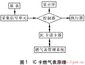 IC卡燃?xì)獗硎且阅な饺細(xì)獗頌橛?jì)量基表,以IC卡為媒體,加裝電子控制器所組成的一種有預(yù)付費(fèi)功能的燃?xì)庥?jì)量裝置。主要是由膜式燃?xì)獗?基表)、采集信號(hào)單元(量值傳感器、磁鋼)、控制器單元(計(jì)費(fèi)器)、執(zhí)行器(電磁閥等)、媒體(IC卡)、電源組成。用氣時(shí)基表數(shù)輪轉(zhuǎn)動(dòng),通過采集信號(hào)單元輸送脈沖信號(hào)到控制器上,利用IC卡完成與燃?xì)獗砉芾硐到y(tǒng)之間的數(shù)據(jù)交換,控制器對(duì)收到的數(shù)據(jù)、信號(hào)做出不同的反應(yīng)或發(fā)出指令,通過顯示屏顯示或?qū)?zhí)行器進(jìn)行開閉控制,對(duì)數(shù)據(jù)實(shí)現(xiàn)雙向反映,從而達(dá)到燃?xì)獗碜詣?dòng)計(jì)量控制[1]。具體原理見圖1。
