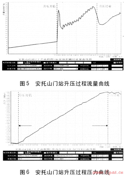 在調(diào)壓方面的應(yīng)用主要是通過手動(dòng)控制或出口調(diào)壓方式來實(shí)現(xiàn)升、降壓。在初期建議采用手動(dòng)控制方式進(jìn)行,通過摸索,尋找合適的壓力步長(zhǎng)、靜止時(shí)間,再采用出口調(diào)壓方式。在升壓過程中如果設(shè)置步長(zhǎng)過大、靜止時(shí)間過短,則流量上升速率過大,造成進(jìn)口壓力下降太快,可能造成上游過流閥切斷;在降壓時(shí)則造成調(diào)壓器閥口開度過小,流量下降速率過大,造成進(jìn)口壓力過高,甚至達(dá)到上游緊急切斷閥切斷壓力值。如果步長(zhǎng)過小、靜止時(shí)間過長(zhǎng),則達(dá)到目標(biāo)壓力所需的時(shí)間過長(zhǎng)。通過摸索,壓力步長(zhǎng)為10~20kPa、靜止時(shí)間在10min左右,壓力、流量的變化較為平穩(wěn)。不同時(shí)段下游用氣量不同,壓力步長(zhǎng)及靜止時(shí)間的設(shè)置也不盡相同。廠站人員在剛開始調(diào)壓時(shí)通常采用手動(dòng)方式,實(shí)施數(shù)次后,觀察流量及上下游壓力變化,選擇出合理的壓力步長(zhǎng)及靜止時(shí)間。圖5、6為改造后安托山門站將壓力由1.341MPa升至1.51MPa的流量、壓力曲線。