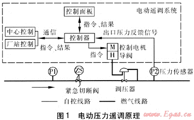電動(dòng)調(diào)節(jié)系統(tǒng)主要由控制器、壓力傳感器和控制電機(jī)組成。中心控制、廠站控制或控制面板給控制器輸入指令,控制器給控制電機(jī)信號(hào),控制電機(jī)直接旋擰調(diào)壓器導(dǎo)閥的調(diào)壓螺桿,實(shí)現(xiàn)調(diào)壓。調(diào)壓過程中,控制器將調(diào)壓器出口處壓力傳感器的反饋值與指令目標(biāo)壓力值比較,根據(jù)比較結(jié)果來控制電機(jī)操作,直至調(diào)節(jié)到目標(biāo)壓力,停止動(dòng)作。該方式調(diào)壓范圍寬,是直接的機(jī)械式作用。電機(jī)為防爆電機(jī),供電壓力為220V。電動(dòng)壓力遙調(diào)原理見圖1。