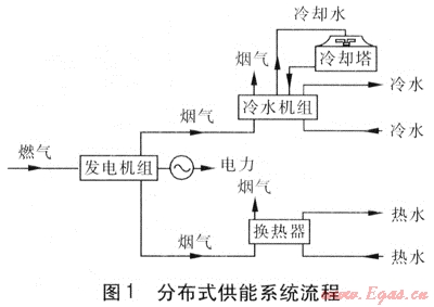 分布式供能系統(tǒng)通常由發(fā)電機組、溴化鋰吸收式冷水機組和換熱設備組成。這里研究的分布式供能系統(tǒng)以天然氣為主要燃料,在用戶側安裝燃氣輪機或燃氣發(fā)動機發(fā)電機組,利用燃料高品位能量進行發(fā)電,產生的電力滿足用戶的電力需求,并通過余熱回收利用設備回收發(fā)電產生的煙氣熱量,向用戶供冷、供熱。分布式供能系統(tǒng)流程見圖1。