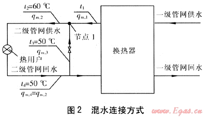 ① 板式換熱器是一種傳熱系數(shù)高、結(jié)構(gòu)緊湊、適應(yīng)性強(qiáng)、拆洗較方便、節(jié)省材料的換熱器。在地板輻射供暖系統(tǒng)中,若采用傳統(tǒng)選型方法,反而需要加大換熱器面積以降低二級(jí)側(cè)的阻力,這無(wú)疑是浪費(fèi)。熱用戶與二級(jí)管網(wǎng)采用混水連接形式既可發(fā)揮板式換熱器高換熱效率的優(yōu)勢(shì),又可降低換熱器二級(jí)側(cè)阻力,實(shí)現(xiàn)優(yōu)化設(shè)計(jì)。