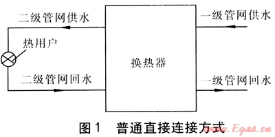 某居民住宅小區(qū),一級(jí)管網(wǎng)設(shè)計(jì)供回水溫度為130、70℃,設(shè)計(jì)供熱面積為5×104m2,設(shè)計(jì)供暖熱指標(biāo)取64W/m2,計(jì)算得出設(shè)計(jì)熱負(fù)荷為3200kW。采用地板輻射供暖系統(tǒng),設(shè)計(jì)供回水溫度為60、50℃。當(dāng)熱用戶與二級(jí)管網(wǎng)采用普通的直接連接方式(見(jiàn)圖1)時(shí),采用某換熱器計(jì)算選型軟件進(jìn)行選型計(jì)算。在分別僅滿足換熱量要求時(shí)、滿足二級(jí)側(cè)阻力要求時(shí),換熱器選型計(jì)算結(jié)果見(jiàn)表1。換熱量安全系數(shù)取1.3,經(jīng)計(jì)算得到,總換熱量為4160kW,對(duì)數(shù)平均溫差為39℃。由表1可知,當(dāng)僅滿足換熱量要求時(shí),換熱面積余量為7.5%;滿足二級(jí)側(cè)阻力要求時(shí),換熱面積余量為135.7%。
