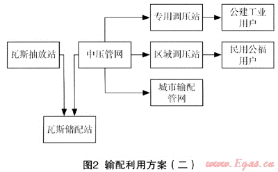 大中型煤礦瓦斯抽采一般分高低濃度兩套抽放系統,這樣為高低濃度瓦斯的利用提供了有利條件。其中35%~45%高濃度瓦斯可以供應礦區(qū)的民用、營業(yè)福利炊事、洗浴爐、燃氣鍋爐、熱風爐、工業(yè)爐窯等的自用氣,同時將大量的剩余瓦斯接入城鎮(zhèn)儲配、輸配系統,供應城市各類燃氣用戶用氣。輸配利用方案見圖2。