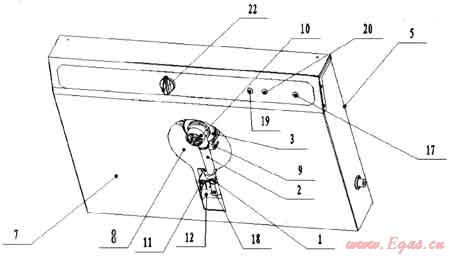 如圖1所示,在本具體實(shí)施例中,本研究項目立式家用燃?xì)庠畎ü鈾C(jī)構(gòu)、點(diǎn)火機(jī)構(gòu)、燃燒機(jī)構(gòu)以及可豎立擺放在櫥柜臺面或桌面4上或安裝在緊挨櫥柜臺面或桌面4的墻壁上的灶具主殼體5,此時灶具主殼體5的高度和寬度都明顯大于其厚度;所述供氣機(jī)構(gòu)包括進(jìn)氣管20、旋塞閥21和旋鈕22,所述進(jìn)氣管28與旋塞閥21相通,所述旋鈕22安裝在旋塞閥21上,所述旋塞閥21通過分氣管25及分氣管接頭26與連接件19連接相通;所述點(diǎn)火機(jī)構(gòu)包括脈;中點(diǎn)火器23和點(diǎn)火針24,所述脈沖點(diǎn)火器23與旋塞閥21連接相通并通過導(dǎo)線與點(diǎn)火針24連接,所述點(diǎn)火針24設(shè)置在爐頭3上;所述燃燒機(jī)構(gòu)包括噴嘴1、引射管2、爐頭3和鍋架9;所述噴嘴1的一端與連接件18連接相通,其另一端與引射管2的一端連接相通;所述引射管2的另一端與爐頭3連接并與爐頭3的火孔相通;所述爐頭3連接有鍋架9:所述灶具主殼體5的后殼面6上連接有轉(zhuǎn)軸固定架11,所述轉(zhuǎn)軸固定架11上設(shè)有一根與其相對轉(zhuǎn)動的轉(zhuǎn)軸12;所述燃燒機(jī)構(gòu)后端的連接件19與灶具主殼體5后殼面6的轉(zhuǎn)軸12連接;所述灶具主殼體5的前殼面7上設(shè)有供燃燒機(jī)構(gòu)在轉(zhuǎn)動過程中通過的孔8,如圖2所示;所述爐頭3底部連接有一個爐頭支撐架10。在本具體實(shí)施例中,本研究項目還在爐頭3邊安裝有熱電偶式熄火保護(hù)裝置27。