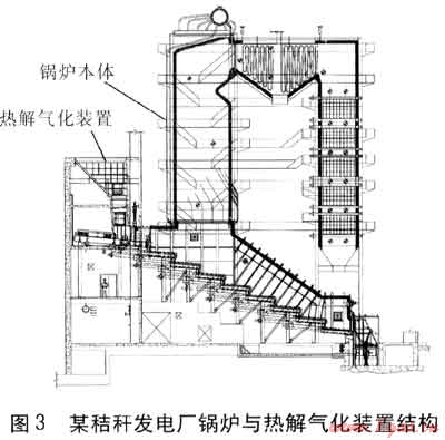 熱解氣化技術(shù)是將農(nóng)林生物質(zhì)在缺氧或微氧狀態(tài)下通過高溫化學(xué)反應(yīng),將其分解成可燃?xì)怏w,作為鍋爐設(shè)備的燃料,實(shí)現(xiàn)能量的轉(zhuǎn)換。目前熱解氣化技術(shù)主要用于發(fā)電。某秸稈發(fā)電廠鍋爐與熱解氣化裝置結(jié)構(gòu)見圖3[19~20]。這種熱解氣化裝置在結(jié)構(gòu)上類似往復(fù)爐排,秸稈在熱解氣化裝置內(nèi)轉(zhuǎn)化為可燃?xì)怏w,燃?xì)鈴腻仩t底部進(jìn)入燃燒室進(jìn)行燃燒。作為熱化學(xué)轉(zhuǎn)化的一種工藝方法,熱解氣化技術(shù)利用熱解氣化裝置將農(nóng)林生物質(zhì)經(jīng)過轉(zhuǎn)化產(chǎn)生的燃?xì)庵苯庸┙o鍋爐設(shè)備燃燒。以熱化學(xué)為基礎(chǔ)的熱解氣化技術(shù),強(qiáng)化了生物質(zhì)的能量密度和能量強(qiáng)度,提高了其利用品位。