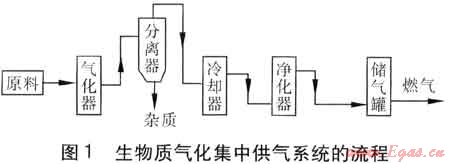 目前,生物質(zhì)資源的處理方式主要有生物質(zhì)氣化技術(shù)[12~14]、固化成型技術(shù)[15~18]。國(guó)內(nèi)提出的生物質(zhì)氣化集中供氣系統(tǒng)的流程見圖1。該技術(shù)采用氣化的方法將農(nóng)林生物質(zhì)轉(zhuǎn)換為可燃?xì)怏w,氣化效率達(dá)到了72%~75%,燃?xì)獾蜔嶂颠_(dá)到5MJ/m3。生物質(zhì)固化成型技術(shù)是將農(nóng)林生物質(zhì)粉碎后,通過成型設(shè)備加工成顆粒、塊、棒、片等形狀直接燃燒。固化成型技術(shù)的工藝、設(shè)備簡(jiǎn)單,燃料便于儲(chǔ)存和長(zhǎng)途運(yùn)輸,易于實(shí)現(xiàn)產(chǎn)業(yè)化大規(guī)模生產(chǎn)和應(yīng)用。這種技術(shù)不需特殊的燃燒設(shè)備,對(duì)現(xiàn)有鍋爐設(shè)備進(jìn)行簡(jiǎn)單改造即可,技術(shù)經(jīng)濟(jì)性能相對(duì)較高。