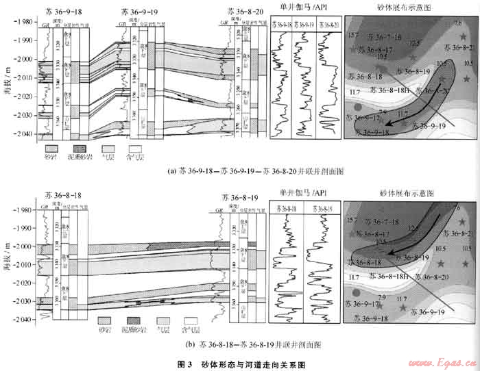 3) 蘇里格氣田河道疊置砂體寬度約600m,河道間寬度在200~300m之間。