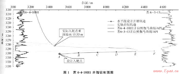 如果設(shè)計靶點低于實際目標層,在有效地層厚度范圍內(nèi)井斜角達不到工程入靶技術(shù)要求,則存在鉆刻目標層、填井重鉆風險。典型井蘇6-4-10H1,設(shè)計靶點在預(yù)測目標層以下15.53m,發(fā)現(xiàn)后及時上調(diào)入靶點,最終使該井成功入靶(圖1)。