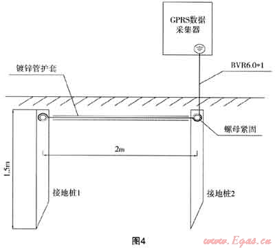 (3) 接地是通過金屬導(dǎo)線與接地裝置連接,將電氣設(shè)備和其他生產(chǎn)設(shè)備上可能產(chǎn)生的漏電流、靜電荷以及雷電電流等引入地下。遠(yuǎn)程抄表系統(tǒng)主要有兩種接地,一是防雷接地,二是屏蔽接地。防雷接地是將220V電源浪涌接地、24V電源浪涌接地、信號(hào)浪涌接地、流量計(jì)表頭感應(yīng)電接地。屏蔽接地是將RS485信號(hào)線屏蔽接地,防止高頻信號(hào)或雜波信號(hào)干擾影響DTU正常工作。與建筑物共用防雷接地體接地電阻應(yīng)小于1Ω;單獨(dú)使用鍍鋅角鋼打接地樁的接地電阻應(yīng)小于4Ω。與接地體連接的接地線應(yīng)使剛6mm2以上的BVR銅芯軟線或銅編織線。單根接地樁接地電阻達(dá)不到4Ω的,打接地樁應(yīng)選擇土層厚實(shí)、雜物較少的地方。單獨(dú)打一根接地樁無(wú)法滿足接地電阻要求,則應(yīng)再增加接地樁,直至滿足接地電阻要求。相鄰兩根接地樁之間的距離不應(yīng)小于2m。接地樁之間應(yīng)使用相同規(guī)格的角鋼焊接或使用6mm2以上的BVR銅芯軟線連接,并用螺絲緊固。其結(jié)構(gòu)如圖4。
