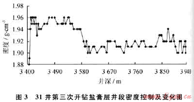 圖3所示為2010年3月31井在第三次開鉆鹽膏層井段(3400~3937m)的密度控制情況。31井第三次開鉆鹽膏層井段初鉆時(shí)密度控制在1.95g/cm3左右,進(jìn)入井深3580m后根據(jù)實(shí)際情況逐步降低了鉆井液密度,合理、適當(dāng)?shù)恼{(diào)整密度范圍以達(dá)到“近平衡鉆井”,不僅給鉆井液日常維護(hù)帶來(lái)了便利,而且明顯提高了鉆井速度、縮短了鉆井周期(第三次開鉆鹽膏層用時(shí)僅30d),很好地實(shí)現(xiàn)了快速、安全、高效的鉆井目標(biāo)。