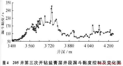 將“護(hù)膠為主、降黏為輔”作為調(diào)控各項(xiàng)性能的指導(dǎo)原則;適當(dāng)降低井漿中的膨潤(rùn)土含量,以降低其發(fā)生各種污染的可能性。高密度飽和鹽水鉆井液由于其密度高、固相含量大,體系本身所固有的固相容量限已被壓縮至一個(gè)很窄的范圍,一旦進(jìn)入體系的劣質(zhì)固相(如鉆屑粉末、泥巖細(xì)顆粒等)來(lái)不及清除,累積到一定程度若其超過體系固相容量上限時(shí),各種固相粒子極易連接形成結(jié)構(gòu),導(dǎo)致鉆井液的黏度和切力增加,從而也會(huì)以污染形式表現(xiàn)出來(lái)[3~5]。如2009年3月205井在第三次開鉆鹽膏層井段(3402~4237m)鉆進(jìn)過程中所發(fā)生的情況(圖4)就是如此,具體表現(xiàn)為鉆井液“黏土固相侵”,黏切劇增,流變性能失穩(wěn)。