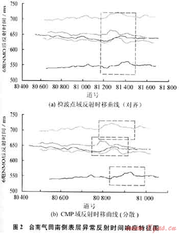 研究結(jié)果表明,不同位置單炮對(duì)于某一反射界面,表層異常和地下含氣異常的反射時(shí)間響應(yīng)在檢波點(diǎn)域和CMP域是正好相反的。在檢波點(diǎn)域里,表層異常導(dǎo)致的反射時(shí)移是對(duì)齊的,在CMP域里是分散的;對(duì)于地下含氣異常,在檢波點(diǎn)域里,含氣異常導(dǎo)致的反射時(shí)移是分散的,在CMP域里是對(duì)齊的。實(shí)際資料應(yīng)用表明(圖2),利用反射時(shí)間法識(shí)別表層異常與含氣異常是可行的,從而為甄別該區(qū)域的表層結(jié)構(gòu)異常提供了一種新的思路和方法。