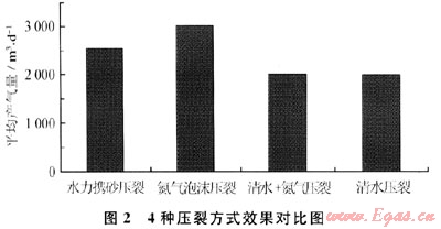 采用4種壓裂方式的壓裂效果對比如圖2所示。從圖2中可以看出:氮?dú)馀菽瓑毫研Ч詈?,壓裂井的平均產(chǎn)氣量為3 037.47m3/d;其次是活性水加砂壓裂壓裂的井,平均產(chǎn)氣量為2540.77m3/d;清水+氮?dú)鈮毫选⑶逅由皦毫研Ч嗖畈淮?,分別為2010.53m3/d和1998.88m3/d。