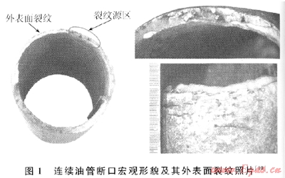 案例2:1.5″(38.1mm)的80鋼級連續(xù)油管在川渝氣田某井進(jìn)行排液作業(yè),在連續(xù)油管回取過程中,連續(xù)油管發(fā)生了開裂。該井為含硫井,作業(yè)過程中未加注SSC緩蝕劑。該卷連續(xù)油管之前還在含H2S氣井中進(jìn)行過4次氣舉排液作業(yè)。連續(xù)油管的回起過程中發(fā)生了開裂,該連續(xù)油管電化學(xué)腐蝕嚴(yán)重,斷口具有脆性特征,其斷口見圖2。