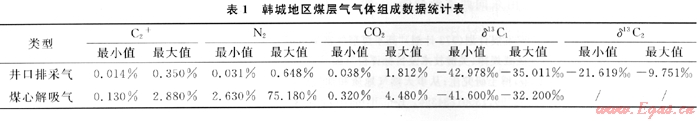 通過對韓城地區(qū)煤層氣演化過程分析,該區(qū)煤層熱演化程度較高,煤層氣主要以熱成因氣為主,盡管在后期改造作用中研究區(qū)的東部煤層出露于地表,可能遭受大氣降水等因素的影響,但煤層氣碳同位素值(通常把δ13C1<-55‰認為是生物成因氣)的特征表明并沒有生物氣的混入。