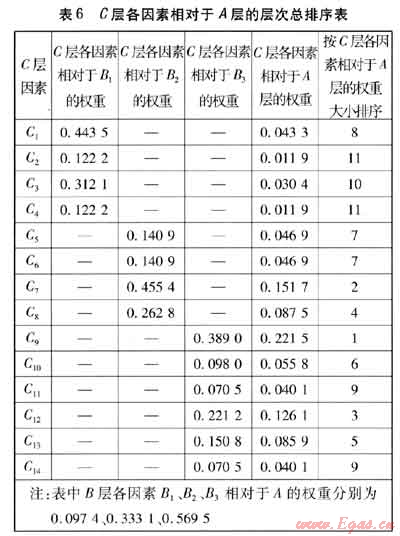 可見,C層各因素相對于A層層次總排序的計算結(jié)果滿足一致性,否則,需要重新調(diào)整判斷矩陣,直至滿足一致性。