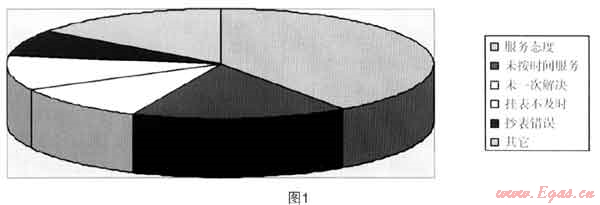 (1) 投訴類:2010年共計受理用戶投訴102戶次,其中35戶次投訴為無效投訴,實(shí)際處理投訴是67戶次(同比增長43%,09年實(shí)際處理投訴是47戶次)。2010年從整個投訴的內(nèi)容來看,主要在以下幾個方面:服務(wù)態(tài)度有27戶次,占投訴的40%;未按照約定時間上門服務(wù)是11戶次,占投訴的16%;上門服務(wù)問題未一次解決造成的投訴有7戶次,占投訴的10%;零星用戶掛表不及時造成投訴7戶次,占投訴的10%;抄錯表數(shù)、未及時抄表造成投訴共5戶次,占投訴的7%;其他投訴10戶次,如圖1所示。
