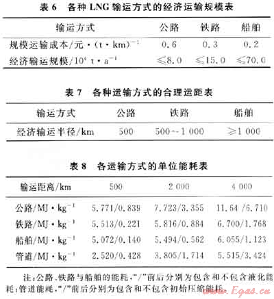 根據(jù)相關資料測算,得到各種運輸方式在不同運輸距離下,輸送單位質(zhì)量LNG的一次能源(換算成天然氣)消耗量如表8所示[4]。