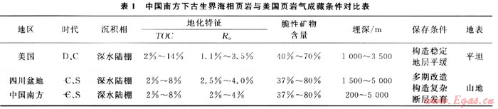 我國(guó)南方地區(qū)具有與美國(guó)東部盆地相似的頁(yè)巖氣成藏地質(zhì)條件和構(gòu)造演化歷史,均屬于古生代海相沉積盆地;沉積環(huán)境為深水相沉積、淺-深水陸棚相;頁(yè)巖的TOC>2%,為富有機(jī)質(zhì)頁(yè)巖,有機(jī)質(zhì)類型為腐泥混合型;頁(yè)巖脆性礦物含量較高,石英、長(zhǎng)石、方解石等脆性礦物總含量大于40%[9~14]。應(yīng)該看到,中國(guó)和美國(guó)頁(yè)巖氣成藏條件也存在較大的差異性(表1),主要表現(xiàn)在以下幾個(gè)方面: