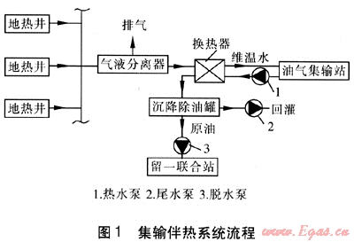 留北潛山油藏是一個(gè)已進(jìn)入特高含水開發(fā)階段的油田,油井采出液溫度為100~130℃,含水率很高。將其改成為地?zé)崽嵋壕?,利用采出的地?zé)崴疅崮?,?shí)現(xiàn)油氣集輸站油氣集輸伴熱系統(tǒng)的維溫,達(dá)到熱、油聯(lián)產(chǎn)和地?zé)豳Y源的有效開發(fā)利用[1]。