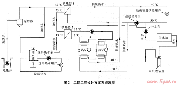 二期工程設(shè)計方案的系統(tǒng)流程見圖2。地熱水抽出后,經(jīng)過除砂器進入板式換熱器1,將30℃地板輻射供暖系統(tǒng)回水加熱至40℃。經(jīng)過板式換熱器1的35℃地熱水經(jīng)板式換熱器2由熱泵提取熱量,作為熱泵的低溫熱源。地熱尾水溫度為13℃。