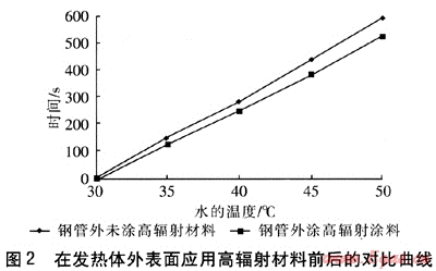 測試平臺(tái)如下:一個(gè)長600mm、寬600mm、高480mm的鐵皮箱,外表覆蓋保溫棉,內(nèi)部以石英加熱管作為熱源,在石英加熱管外部套上鋼管,鋼管受熱后,加熱旁邊的水杯。采用兩種測試方案,第一種方案是在鋼管外部涂刷高輻射材料,記錄杯中水的溫升隋況,另一種方案是鋼管外部不涂刷高輻射材料,杯內(nèi)放同樣質(zhì)量的水,記錄水的溫升情況。多次測量后,取平均值。在發(fā)熱體外表面應(yīng)用高輻射材料前后的對(duì)比曲線見圖2。