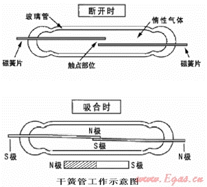 干簧管由一對(duì)由磁性材料制造的彈性磁簧組成,磁簧密封于充有惰性氣體的玻璃管中,磁簧端面互疊,但留有一條細(xì)間隙。磁簧端面觸點(diǎn)鍍有一層貴金屬,使開(kāi)關(guān)具有穩(wěn)定的特性和延長(zhǎng)使用壽命。