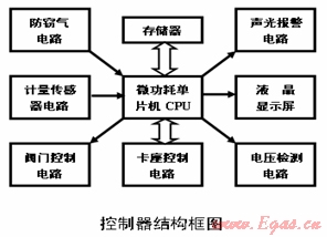 2、控制器:控制器一般由計(jì)量傳感器電路、微功耗單片機(jī)、微功耗閥門(mén)、電壓測(cè)試電路、防竊氣電路等部分組成(如圖所示)。具有精確記數(shù)功能、功能卡傳輸媒介功能、閥門(mén)自動(dòng)處理功能、非法操作處理功能、欠壓處理功能、掉電處理功能、數(shù)據(jù)下載功能、數(shù)據(jù)顯示與聲音提示功能等。采用單片機(jī)對(duì)傳感器的脈沖進(jìn)行計(jì)量、分析處理,并驅(qū)動(dòng)相應(yīng)的部件進(jìn)行控制。主要包括CPU、讀寫(xiě)卡接口、顯示、計(jì)數(shù)等輔助部件,是IC卡燃?xì)獗淼暮诵脑O(shè)備。