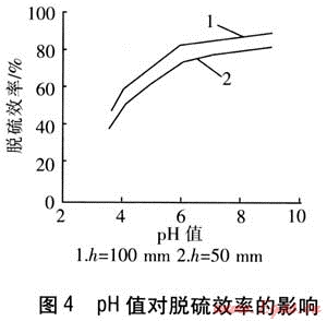 脫硫劑pH值是影響脫硫效率的一個(gè)重要參數(shù),也是脫硫過程中可調(diào)的參數(shù)。選擇適當(dāng)?shù)膒H值,不僅能夠保證足夠高的脫硫效率,還可以降低運(yùn)行成本,保證脫硫系統(tǒng)的穩(wěn)定運(yùn)行。實(shí)驗(yàn)選擇的石灰脫硫劑體積分?jǐn)?shù)為10%;h為高液位溢流管管口距沖擊管出口的距離,分別取50、100mm;低液位溢流管管口距沖擊管出口的距離為20mm。脫硫劑pH值對脫硫效率的影響見圖4。由圖4可知,脫硫劑pH值為3.8~6.0時(shí),脫硫效率隨pH值的增加變化較快;pH值>6時(shí),脫硫效率變化緩慢。h=100mm時(shí),噴射速度提高,引射的液量增加,鼓泡通過液層的高度和運(yùn)動(dòng)的距離增加,氣液交換的時(shí)間延長,脫硫效率較高,阻力隨之增大。