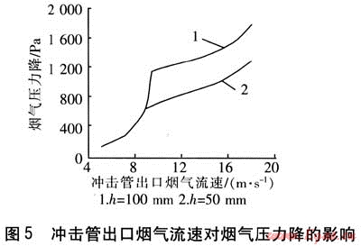 沖擊管出口煙氣流速對煙氣壓力降的影響見圖5。由圖5可知,當(dāng)h=50mm、沖擊管出口煙氣流速為5.0~8.4m/s時(shí),液位由低液位溢流管控制,氣體通過沖擊管出口與液位高度為20mm的空間發(fā)生氣體卷吸液體的現(xiàn)象。隨著流速的增大卷吸現(xiàn)象加劇,被卷吸的液體量增加,氣液接觸主要在上升通道內(nèi)進(jìn)行,氣體壓降隨流速增加。當(dāng)沖擊管出口煙氣流速超過8.4m/s時(shí),液位開始下降,低液位溢流管失效,沖擊管出口與液位形成的空間變大,上升通道內(nèi)煙氣流速迅速提高,動(dòng)壓加大、靜壓減小,套管兩側(cè)形成壓力差,套管外側(cè)液體通過排孔流入上升通道與上升氣流混合。下降氣流在此空間轉(zhuǎn)向流動(dòng),速度滯流動(dòng)壓轉(zhuǎn)化為靜壓,在排孔兩側(cè)形成壓力差,煙氣通過排孔進(jìn)入液相形成鼓泡。當(dāng)沖擊管出口流速為18m/s時(shí),煙氣壓力降為1300Pa。