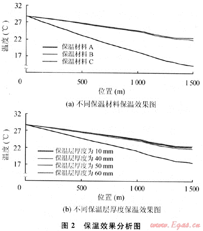 對(duì)材料B分別進(jìn)行保溫厚度的敏感性分析,分析結(jié)果如圖2(b)所示。由圖可知:不同材料沿程溫度變化規(guī)律基本一致,但保溫材料傳熱系數(shù)越大,沿程溫度變化越明顯;隨著保溫層厚度的增加,保溫效果越好,但當(dāng)保溫層厚度增加到一定值時(shí),保溫效果的增加程度不明顯。