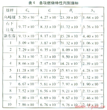 可燃性指數(shù)Cb主要反映煤樣燃燒前期的反應(yīng)能力,該值越大,表明可燃性越好。各煤樣的可燃性指數(shù)Cb見(jiàn)表4。由表4可知,單煤樣中,石下江煤、新東煤的可燃性較好,烏峰煤的可燃性較差。混煤的可燃性基本介于兩種單煤的可燃性之間,且隨著某種單煤比例的增加,混煤的可燃性指數(shù)Cb逐漸向該煤種靠近。烏峰煤與石下江煤按2:8摻混時(shí),混煤的可燃性明顯變好。