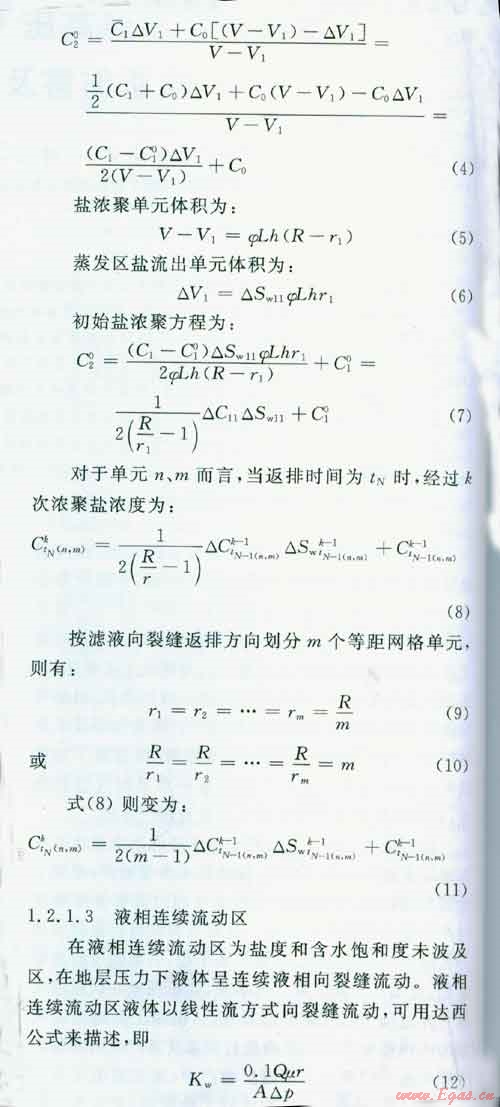 在返排初期,存在著濾液前緣初始蒸發(fā)區(qū)、過渡區(qū)和液相連續(xù)流動(dòng)區(qū)。在濾液進(jìn)入地層最前緣區(qū)主要存在氣一液混合相,即濾液與地層天然氣流體組成的水一烴多組分混合體系,其余濾失區(qū)充滿高鹽度的加重液濾液。受地層加溫作用,前緣區(qū)濾液溫度非常接近地層溫度,其溫度介于120~140℃。當(dāng)開井返排時(shí)因壓力劇集下降,此時(shí)前緣區(qū)氣一液混合相將發(fā)生變化,部分濾液中液相蒸發(fā)成水蒸氣[2-3],并以氣一液體混合相向裂縫流動(dòng),使前緣區(qū)液相逐步減少,殘留液體的鹽度增加,并向相鄰單元擴(kuò)散和傳輸[4-7],從而增加與此接觸過渡區(qū)液體的鹽度,其余區(qū)域?yàn)V液仍為連續(xù)液相向裂縫流動(dòng)。