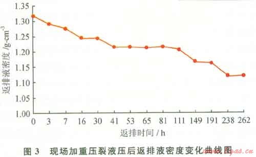 以某高溫高壓氣井使用加重壓裂液施工為例,該井氣層井深5300m,地層溫度145℃。采用40%加重劑加重瓜膠壓裂液,其密度達(dá)1.32g/cm3。在最大泵壓88 MPa下注入地層總液量632.5m3和陶粒42.8m3。該氣井壓裂后獲得高產(chǎn)氣流,增產(chǎn)效果顯著。但現(xiàn)場(chǎng)監(jiān)測(cè)壓裂后返排出地面液體性能表明,壓后液體破膠較徹底,返排液體黏度在3mPa·s。左右,但返排液體密度比壓裂前液體密度低0.1~0.2g/cm3,且隨返排時(shí)間增加返排出的液體密度逐漸下降(圖3)。表明該井在儲(chǔ)層增產(chǎn)作業(yè)過程中已產(chǎn)生了部分鹽析造成鹽分丟失,使得壓后返排液體密度下降。在該地區(qū)采用相同加重壓裂工藝改造的氣井普遍存在類似現(xiàn)象。