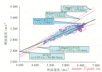 根據(jù)這些關(guān)系式的原理,在塔中地區(qū),通過(guò)實(shí)測(cè)的縱橫波數(shù)據(jù)擬合出適合本區(qū)的縱橫波關(guān)系式,用以進(jìn)行橫波估算。即