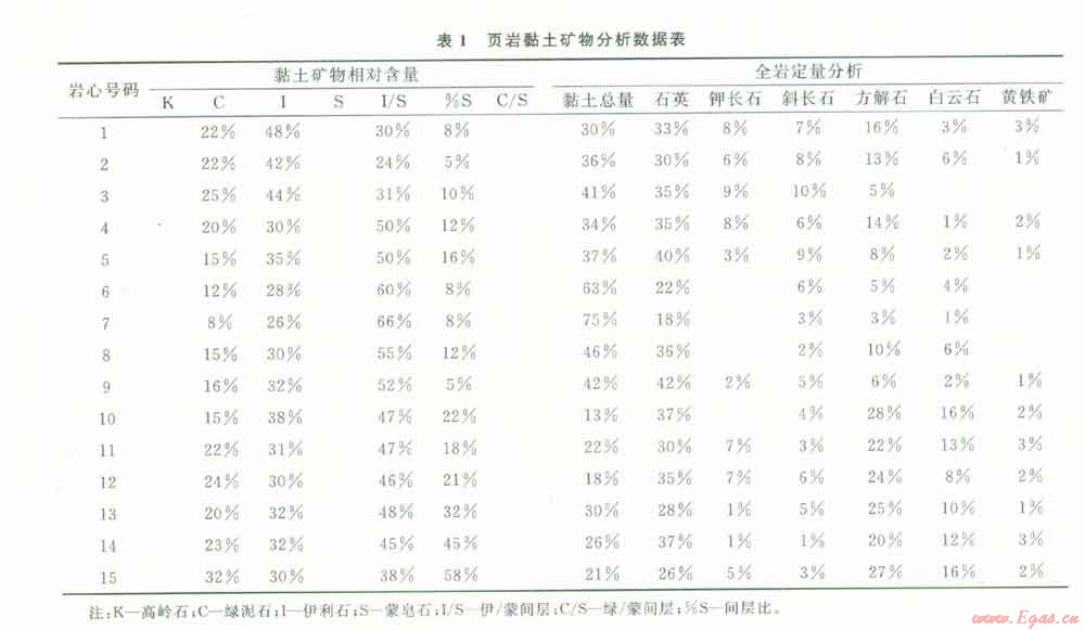 對所研究的頁巖氣藏的巖心進行X射線衍射全巖分析和黏土礦物測定(表1),發(fā)現(xiàn)黏土礦物的總含量主要介于20%~70%,黏土礦物主要為綠泥石、伊利石、蒙皂石以及伊蒙混層,這些黏土礦物中伊利石和伊蒙混層的含量較高,伊利石相對含量主要介于20%~50%,伊蒙混層相對含量主要介于20%~70%.而蒙皂石和綠泥石的含量平均相對偏低。非黏土礦物主要為石英、鉀長石、方解石、白云石、斜長石、黃鐵礦等,其中石英的含量最高,相對平均含量在2()%~5()%,黃鐵礦和斜長石的相對平均含量最低,介于l%~5%。石英含量越多說明巖石的脆性越好,天然裂縫越容易發(fā)育,越有利于人工壓裂。