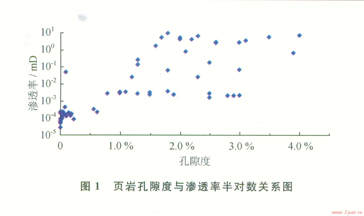 利用PoroPerm 200型孔滲儀對該頁巖氣藏的巖心進行孔隙度與滲透率測量,實驗中滲透率的測試方法為脈沖測試法,發(fā)現(xiàn)該頁巖的孔隙度主要分布在0.01%~5%,滲透率主要分布在0.000 01~10 mD,頁巖的孔隙度與滲透率沒有明顯的相關關系(見圖1)。滲透率大于l mD的頁巖巖心中存在著明顯的天然裂縫或取心誘導裂縫。