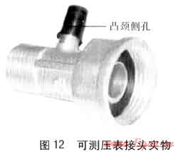 如圖12所示,可測壓表接頭是安裝于燃氣計量表進出口端的產(chǎn)品。在普通表接頭的基礎上研制出可測壓表接頭,可測壓表接頭上帶有一個具有凸頸的側(cè)孔,能夠方便地將測壓儀表通過凸頸安裝在表接頭上。通常情況下該側(cè)孔采用密封圈、螺釘及防護套堵住,保證管道密封性。當需要測壓時,去掉密封圈、螺釘及防護套,打開側(cè)孔,安裝上測壓儀表即可測量壓力。測完之后,拆下測壓儀表,再采用密封圈、螺釘及防護套將側(cè)孔堵住,保證普通表接頭原有功能。