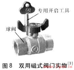 圖8所示閥門為可實現(xiàn)可關(guān)不可開或可自由開關(guān)與可關(guān)不可開互換功能的雙用磁式產(chǎn)品,當閥門處于可關(guān)不可開狀態(tài)時,須通過專用開啟工具才能實現(xiàn)自由開關(guān)。該結(jié)構(gòu)關(guān)鍵技術(shù)在于閥體凸頸部有兩凸臺,凸臺上有平行凸頸中心線的盲孔,手柄正上端面設有A和B標志的兩螺紋孔以及帶強磁的A和B的螺塞。當閥門需要從關(guān)閉到開啟狀態(tài)實現(xiàn)可關(guān)不可開的功能時,只需通過專用開啟工具將手柄上A螺紋孔安裝B螺塞或B螺紋孔安裝A螺塞或A、B螺塞任意去掉其中一個或A、B螺塞都不安裝,即可實現(xiàn);當閥門需要實現(xiàn)可自由開關(guān)與可關(guān)不可開互換的功能,只需通過專用開啟工具將手柄上A螺紋孔安裝A螺塞或B螺紋孔安裝B螺塞,利用磁場“同性相斥,異性相吸”的原理,即可實現(xiàn)作為普通閥門自由開關(guān)功能。產(chǎn)品出廠一般設置為可關(guān)不可開的狀態(tài)。