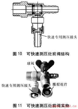 圖10、11所示閥門為可實現(xiàn)不用關(guān)閉或切斷管道燃氣的情況下進行快速測壓的燃氣閥門。不要測壓時,灶前閥處于開啟狀態(tài),測壓裝置處于常自閉狀態(tài),即密封狀態(tài)。需要測壓時,只需逆時針擰下螺帽組件,將快速專用測壓接頭連接到測壓接口,使快速專用測壓接頭接觸預設測壓工作區(qū)域,并逐步順時針擰緊,推動閥芯壓縮彈簧向內(nèi)移動,使測壓接口內(nèi)的密封口脫離密封臨界設置同時達到無外泄漏,從而使燃氣順利流動。當測壓完畢后,將快速專用測壓接頭逆時針擰出測壓接口,密封墊在彈簧的作用下迅速歸位,達到無泄漏狀態(tài),擰緊螺帽組件進行保險密封,可以實現(xiàn)快速、安全地進行測壓作業(yè)。該產(chǎn)品公稱壓力不大于1.6MPa,工作溫度為-20~120℃。