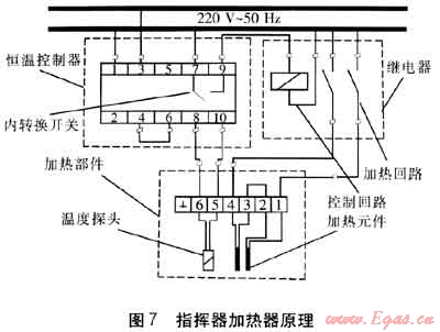 指揮器加熱器結構簡單,主要由加熱部件(見圖6)、恒溫控制器和繼電器三部分組成,其中恒溫控制器和繼電器只能安裝在非防爆區(qū)域,通過導線對加熱部件進行連接,加熱部件則通過配件安裝在調(diào)壓器指揮器上游信號管上,通過加熱部件中的加熱元件對指揮器信號管內(nèi)的燃氣進行加熱。指揮器加熱器是通過不同的元器件的綜合作用達到自動控制加熱的目的,原理見圖7,圖中的數(shù)字1~10為開關接線端子編號,接線時按圖7要求,其中2、5端子為備用。設: