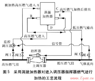 采用渦漩加熱器對進入調(diào)壓器指揮器燃氣進行加熱的工藝流程見圖5。