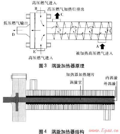 高壓燃氣通過渦漩先導燃氣加熱器(以下簡稱渦漩加熱器)時,渦漩加熱器將燃氣減壓產(chǎn)生的能量轉(zhuǎn)化成高溫熱氣流,然后利用高溫熱氣流對調(diào)壓器指揮器進行加熱。
