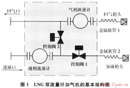 LNG為超低溫液體,其溫度一般在-140℃以下,且極易氣化,在加注過程中部分液體不斷氣化,這對(duì)貿(mào)易交接中LNG的準(zhǔn)確計(jì)量和將LNG順利加注到儲(chǔ)氣罐中提出了極大的挑戰(zhàn)。LNG加氣機(jī)一般分為雙流量計(jì)(包括液相和氣相流量計(jì))系統(tǒng)和單流量計(jì)(無(wú)氣相流量計(jì))系統(tǒng)。目前,主流的LNG加氣機(jī)采用雙流量計(jì),典型的LNG雙流量計(jì)加氣機(jī)的基本結(jié)構(gòu)如圖1所示,主要由加液通路、回氣通路和控制閥組成。